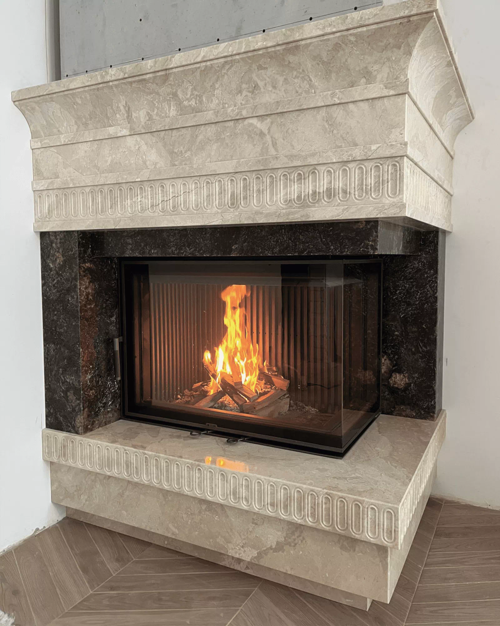 Шелкография завершает обрамление очага, гармонируя с внутренним убранством топочной части.