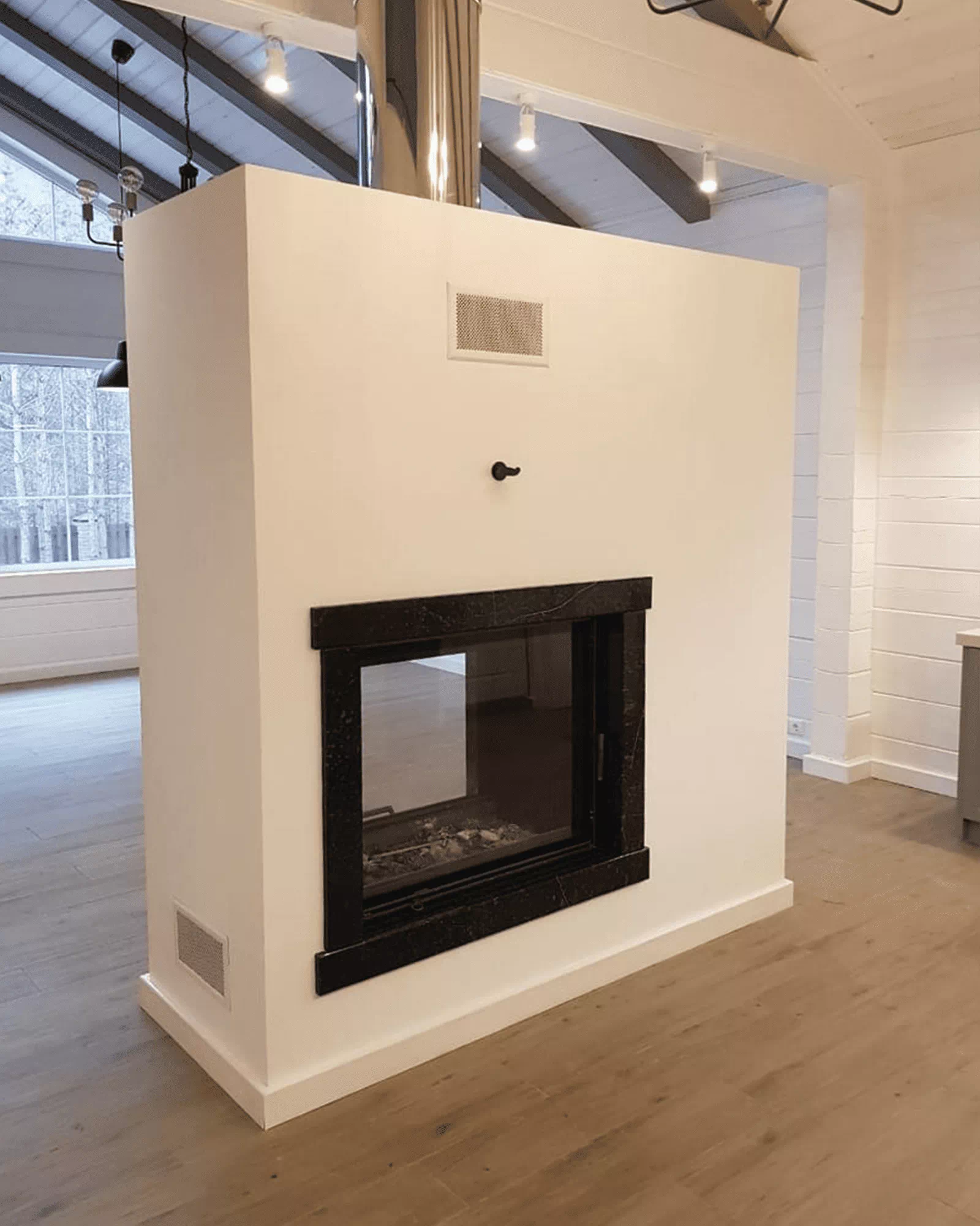 Две дверцы с прямым стеклом. Пространная, сквозная модель, великолепно вписывается в межкомнатные перегородки, для созерцания огня как из гостиной, так и из спальни или кабинета, служит отличной основой для создания центрального (островного) камина.