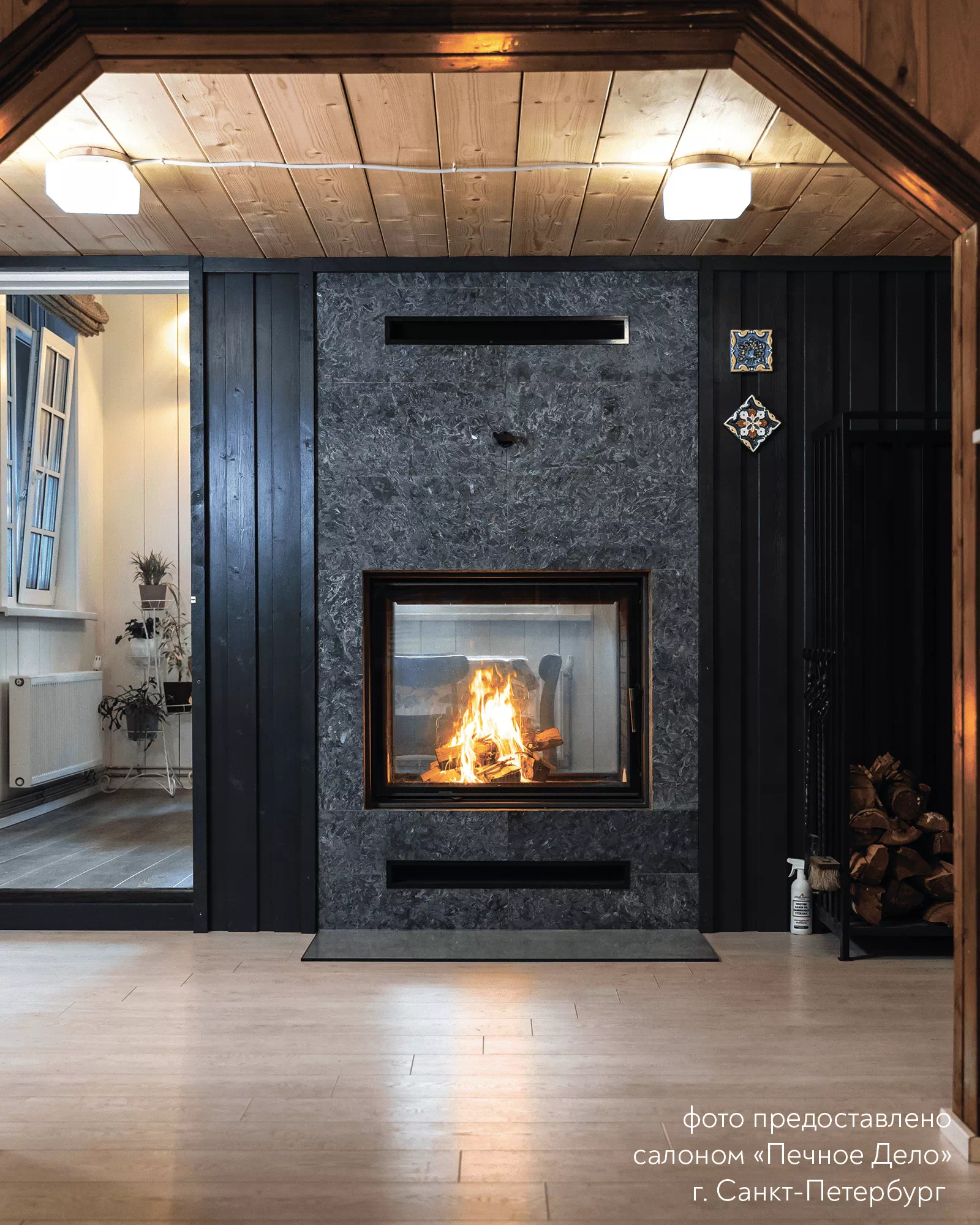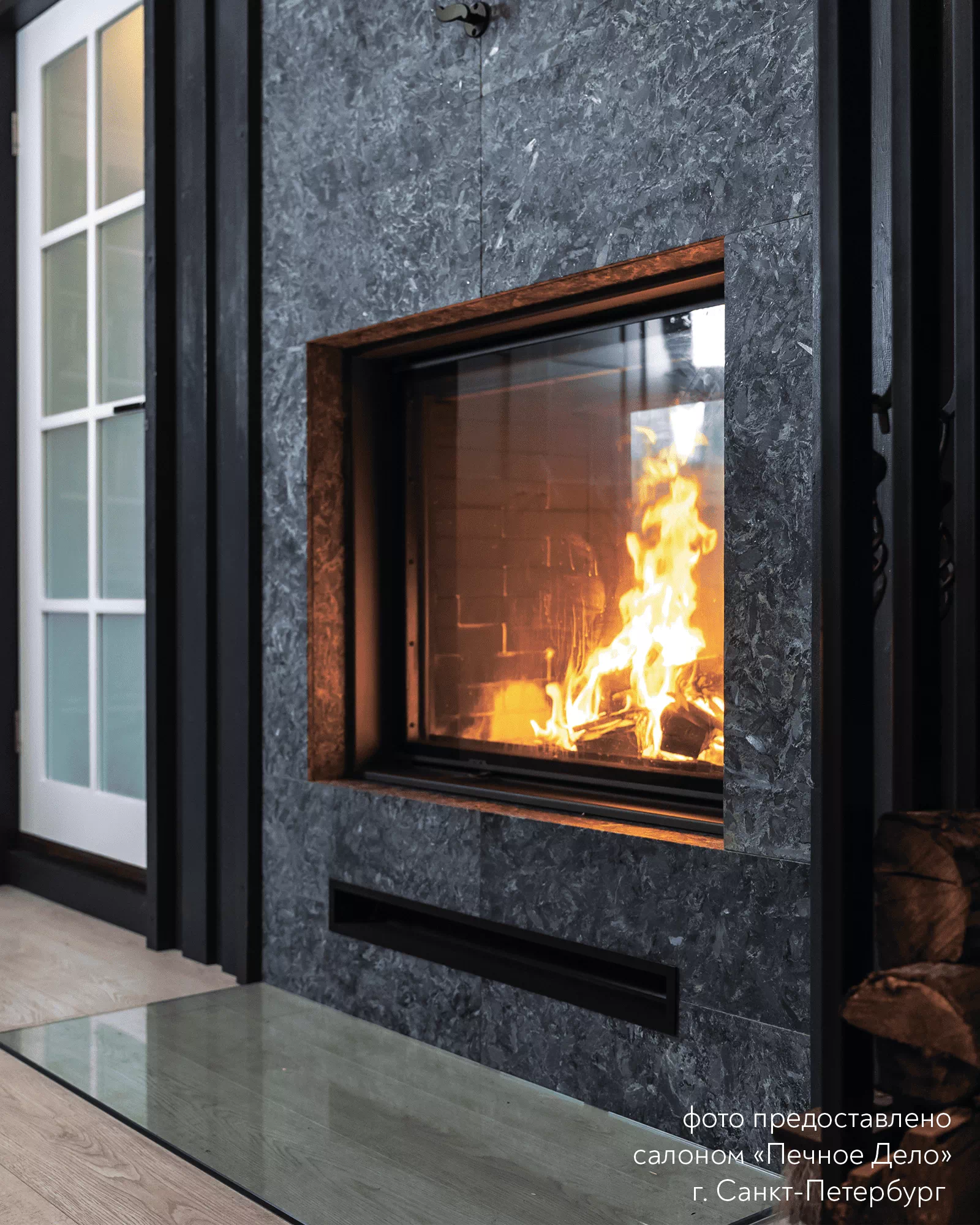Шелкография завершает обрамление очага, гармонируя с внутренним убранством топочной части.