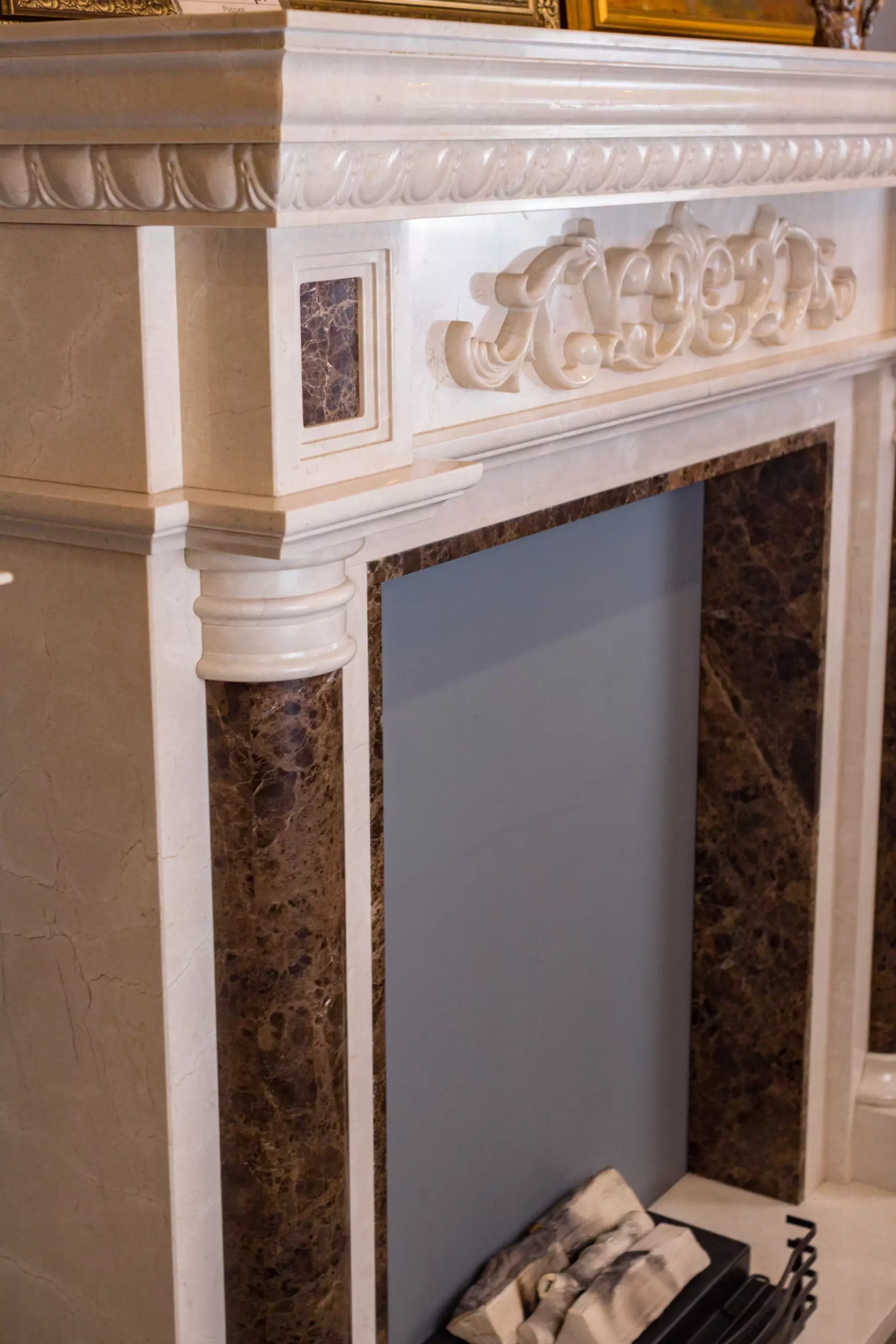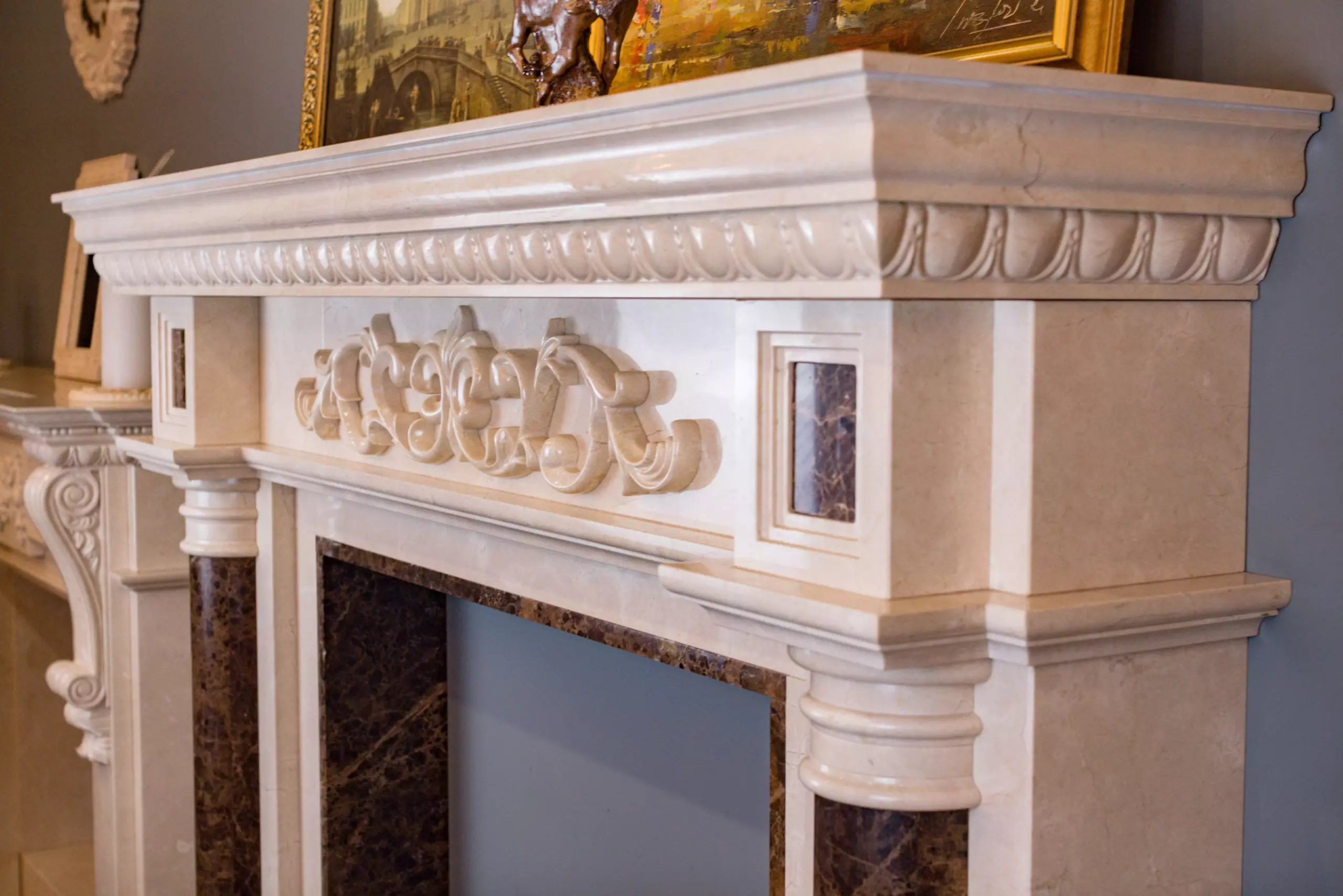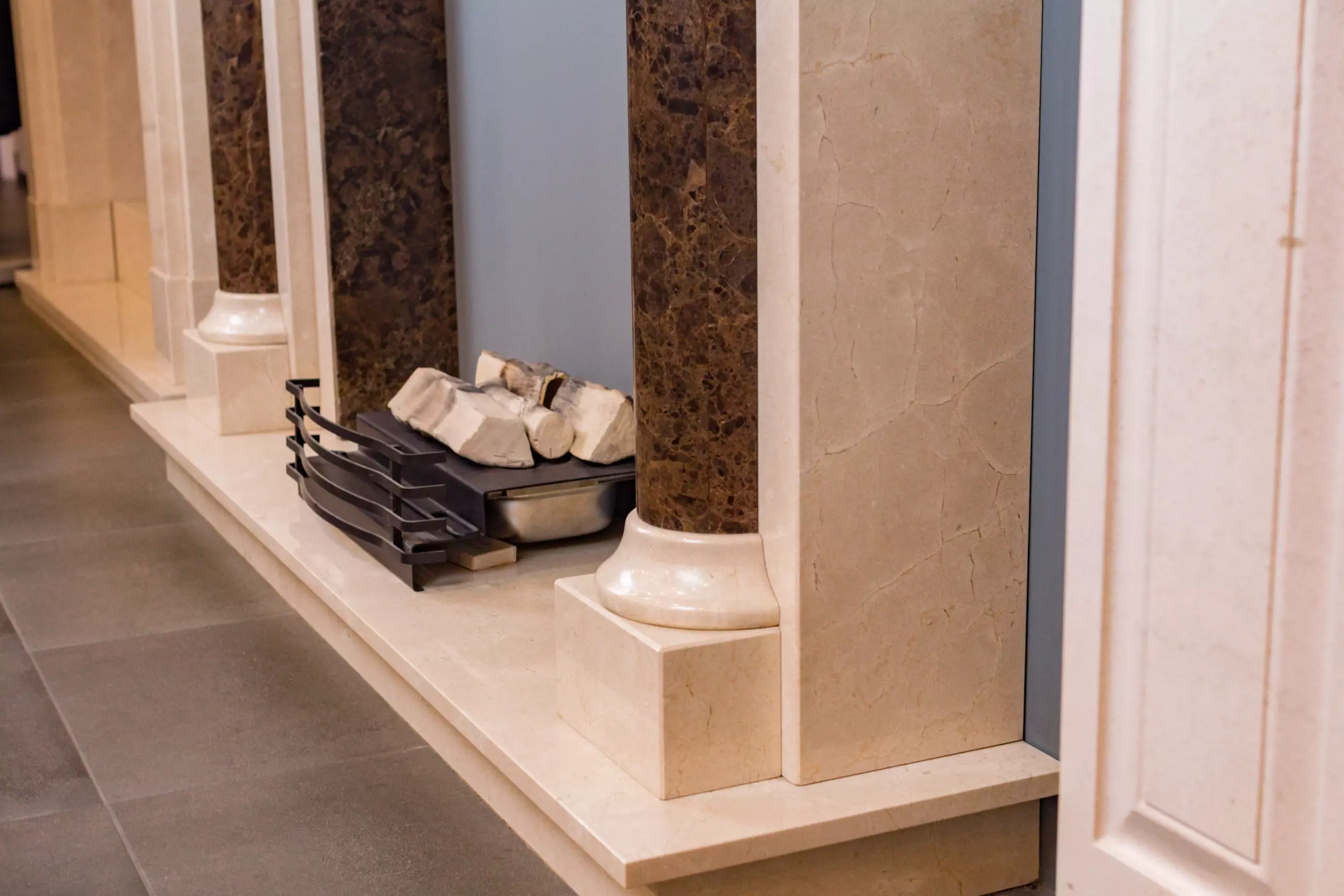 Портал совместим с топками ПС7363, ПС8057. Материал по каталогу — Crema Marfil. Этот элегантный классический портал может быть изготовлен из мрамора Emperador Dark, Calisia Capri, Travertine Light, Sunny Dark.
