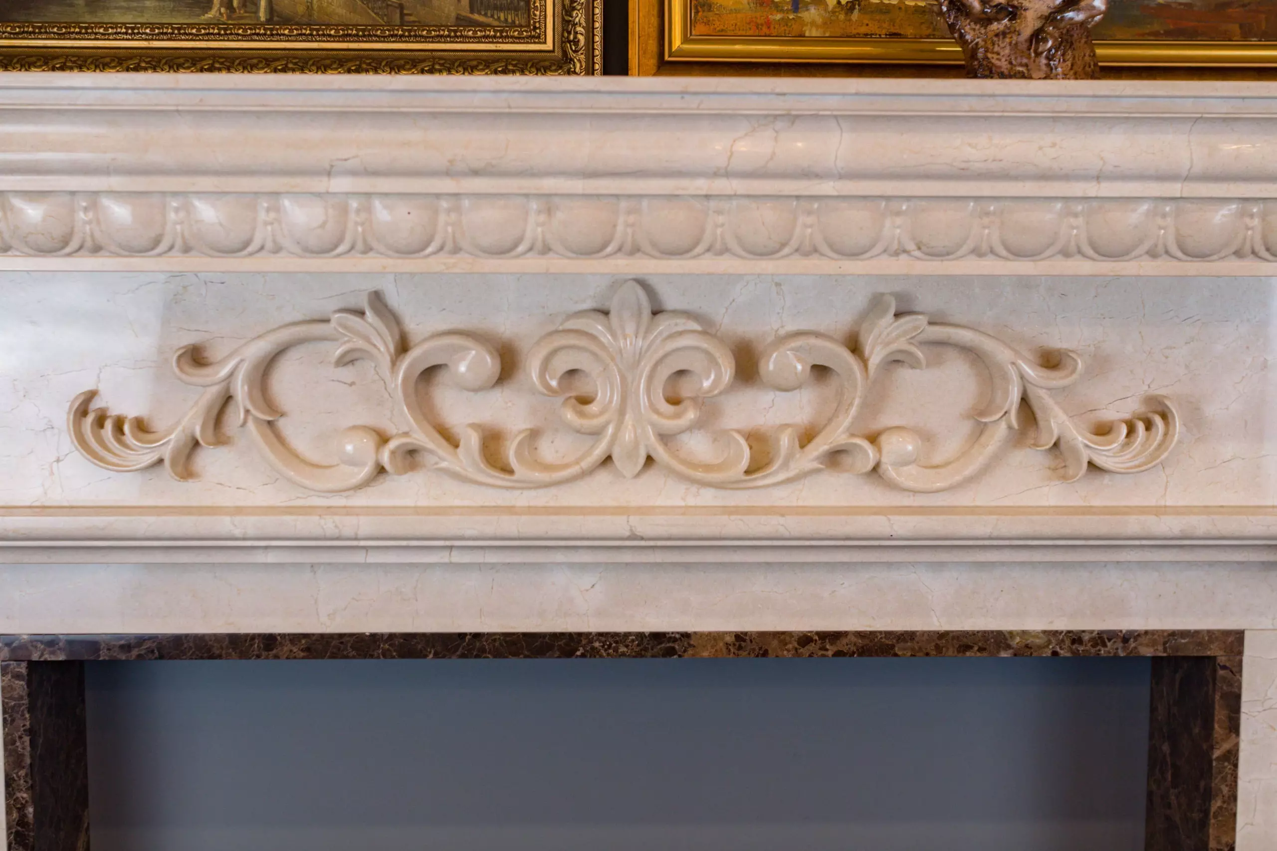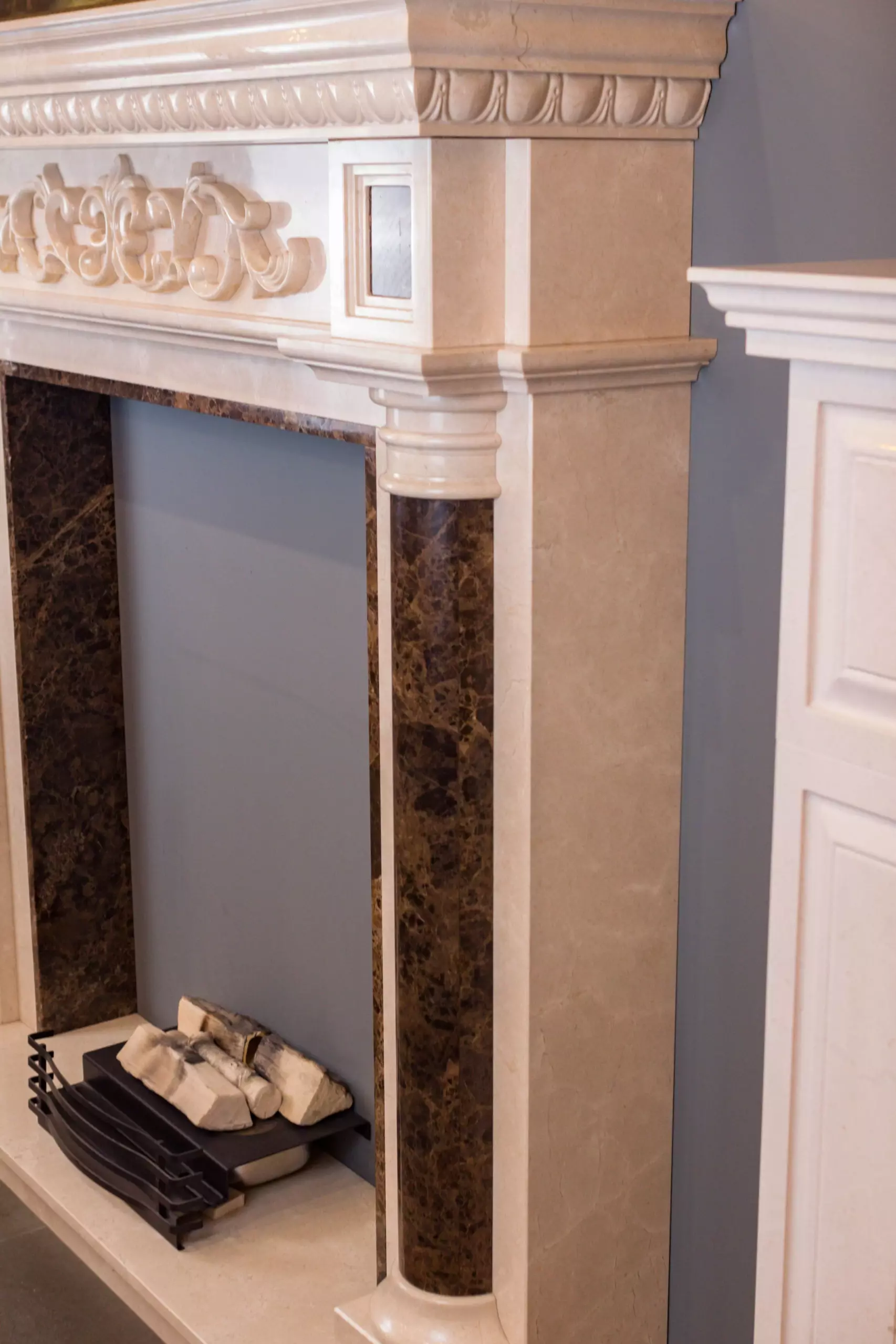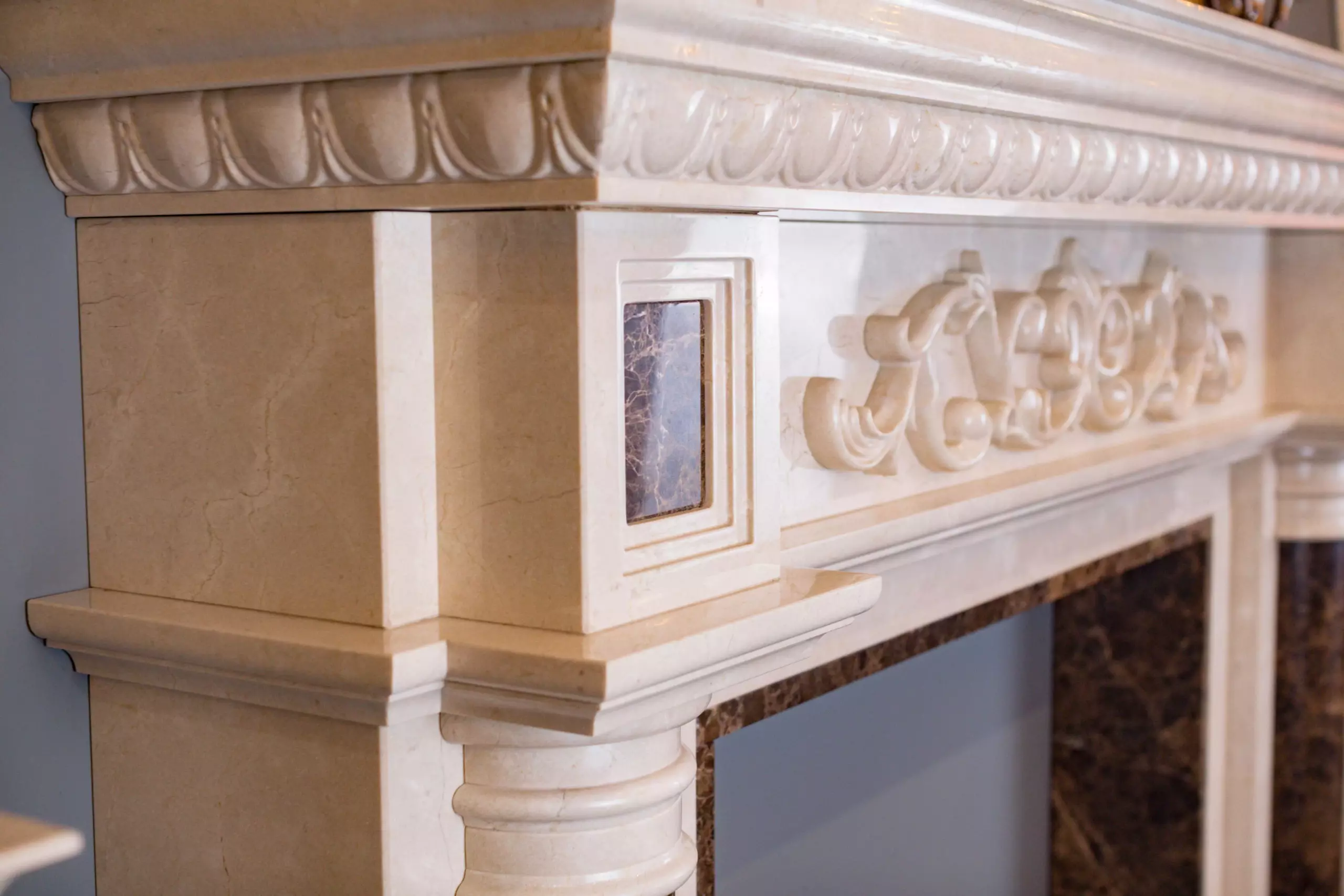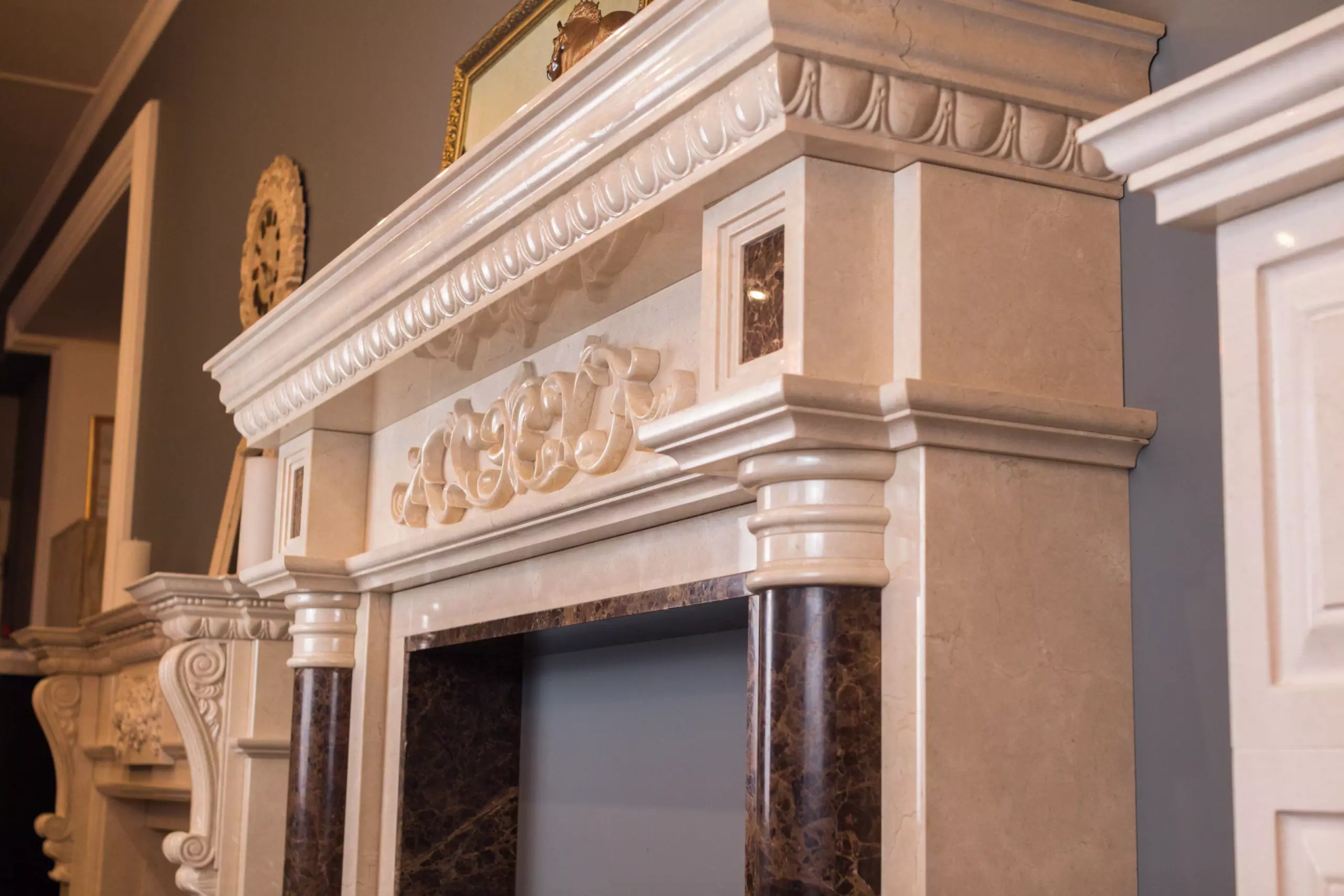 Портал совместим с топками ПС7363, ПС8057. Материал по каталогу — Crema Marfil. Этот элегантный классический портал может быть изготовлен из мрамора Emperador Dark, Calisia Capri, Travertine Light, Sunny Dark.