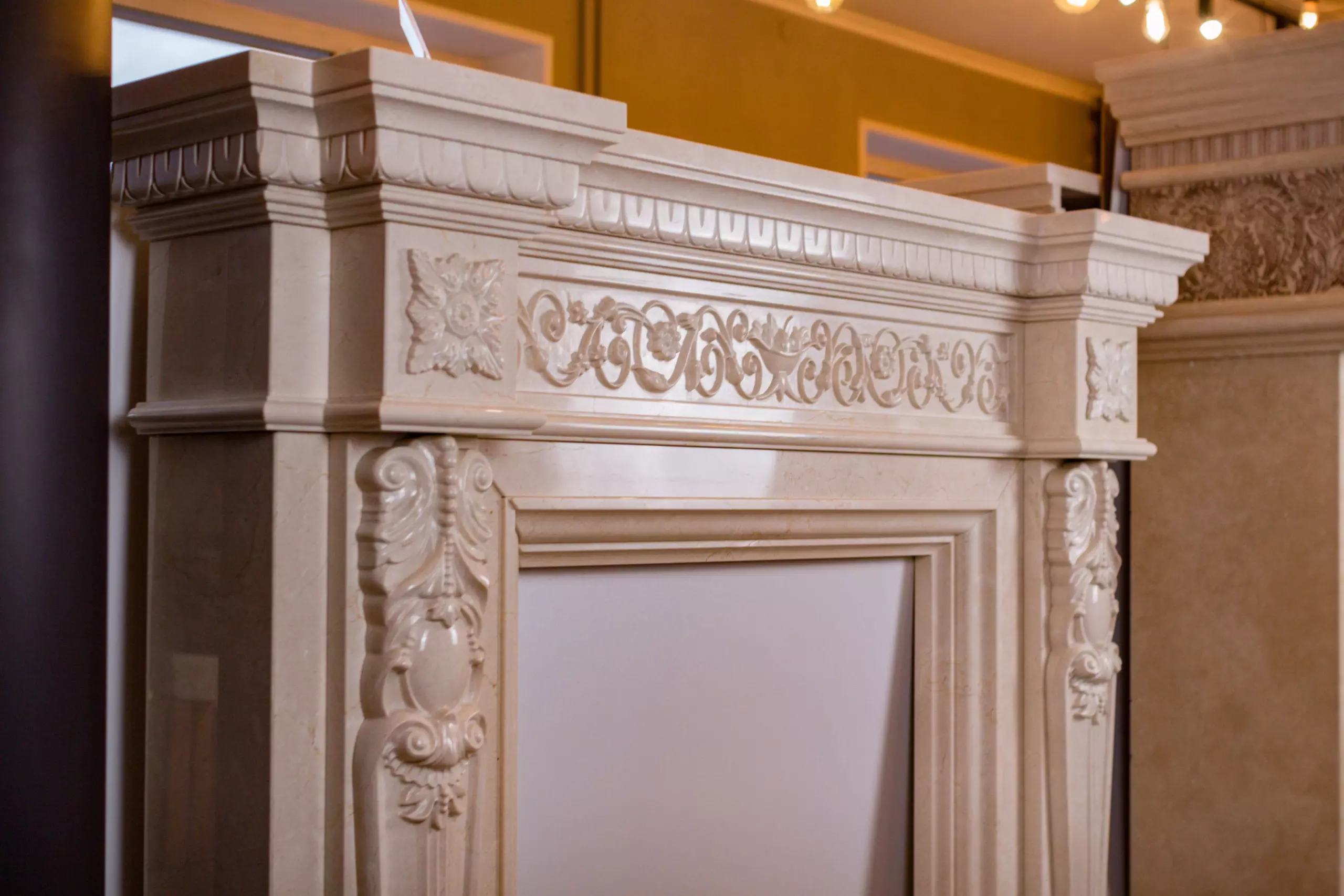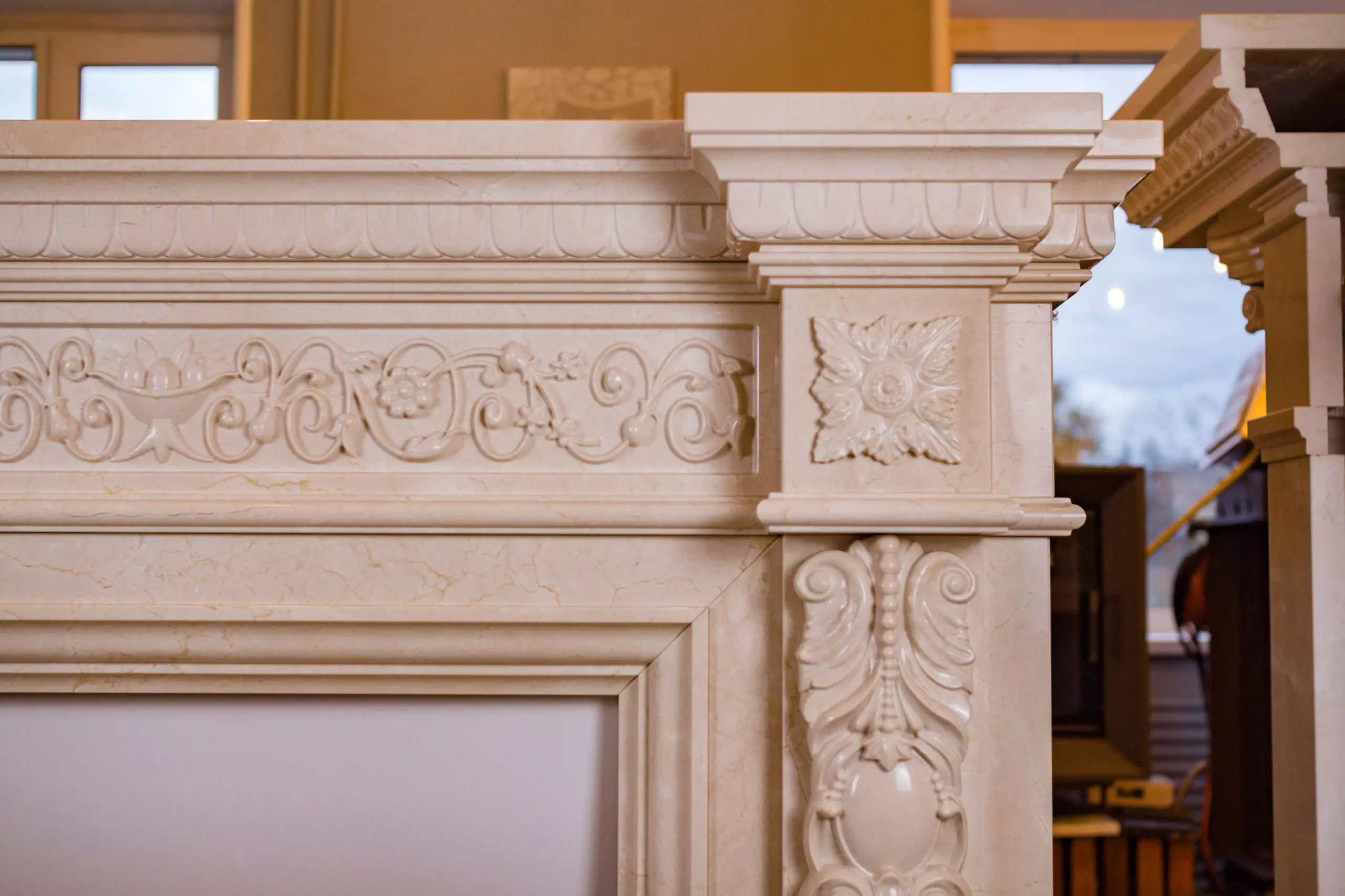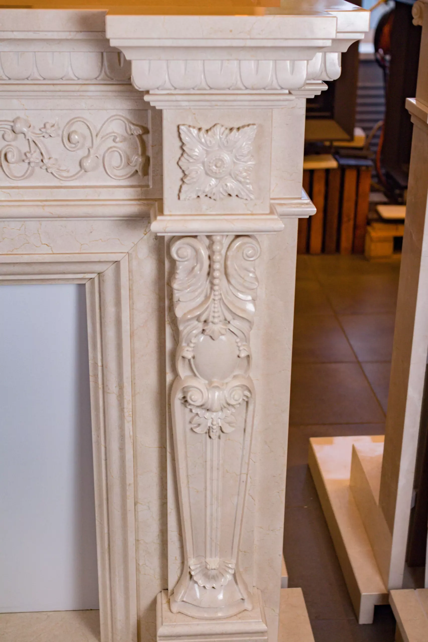 Портал совместим с топками ПС7363. Материал по каталогу — Crema Marfil. Этот элегантный классический портал может быть изготовлен из мрамора Emperador Dark, Calisia Capri, Travertine Light, Sunny Dark.