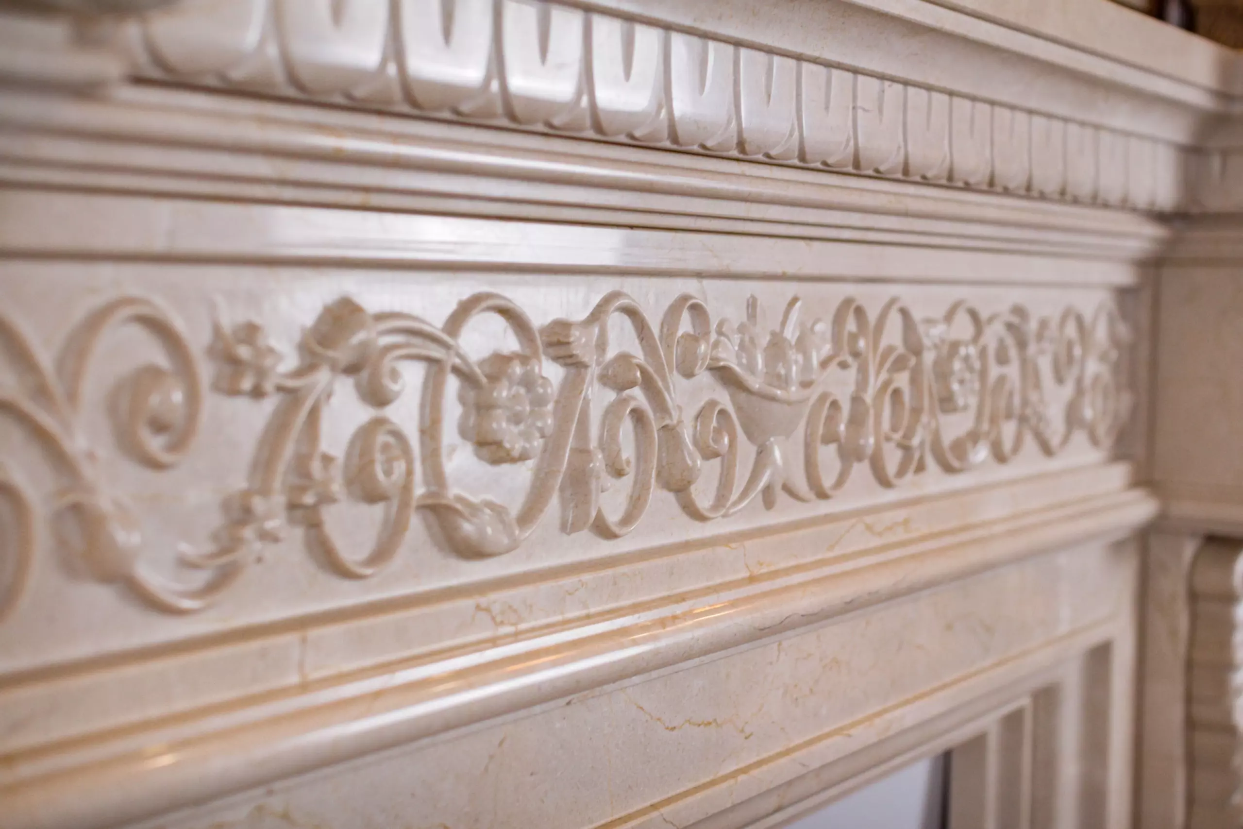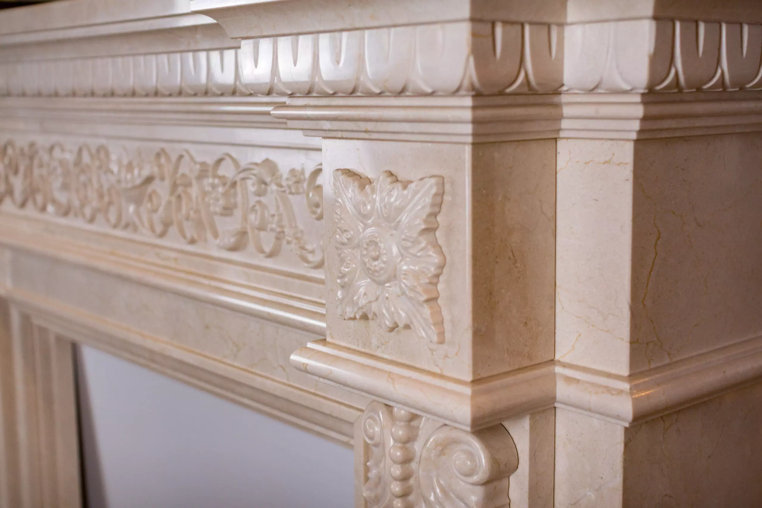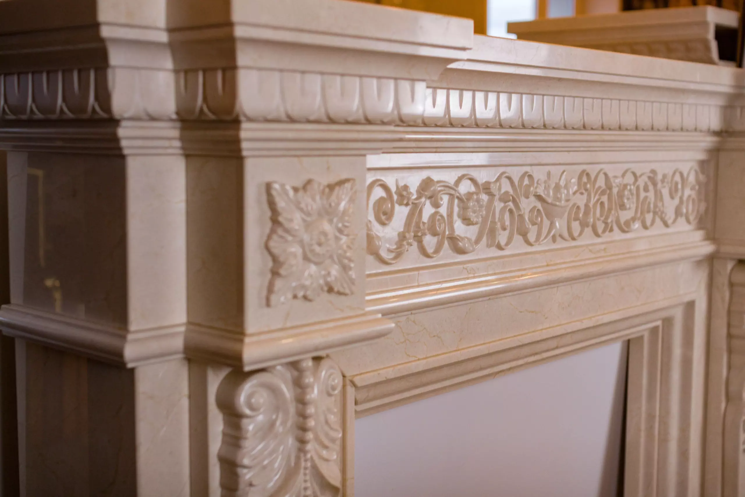 Портал совместим с топками ПС7363. Материал по каталогу — Crema Marfil. Этот элегантный классический портал может быть изготовлен из мрамора Emperador Dark, Calisia Capri, Travertine Light, Sunny Dark.