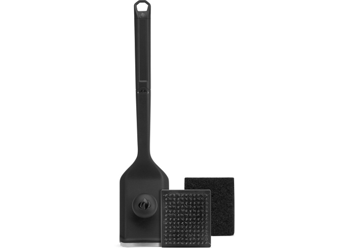 Щётка с двумя насадками предназначена для очистки любых поверхностей гриля. Состоит из универсальной рукоятки с нескользящим покрытием и двух сменных насадок. На конце щётки расположен скребок из нержавеющей стали предназначенный для очистки прикипевших продуктов. Сменная насадка с упругим, износостойким ворсом из нержавеющей стали позволяет справиться с любыми загрязнениями решёток гриля, возникшими при готовке. С помощью сменной насадки с абразивной губкой можно удалить пригоревшие остатки пищи с любых поверхностей гриля. Насадки надёжно фиксируются на ручке щётки с помощью винта с шаровидной рукояткой из термостойкого пластика, которая обеспечивает надёжный хват, если требуется приложить больше усилий при очистке. Щётка позволяет очищать любые поверхности гриля, нагретые до максимальных температур.